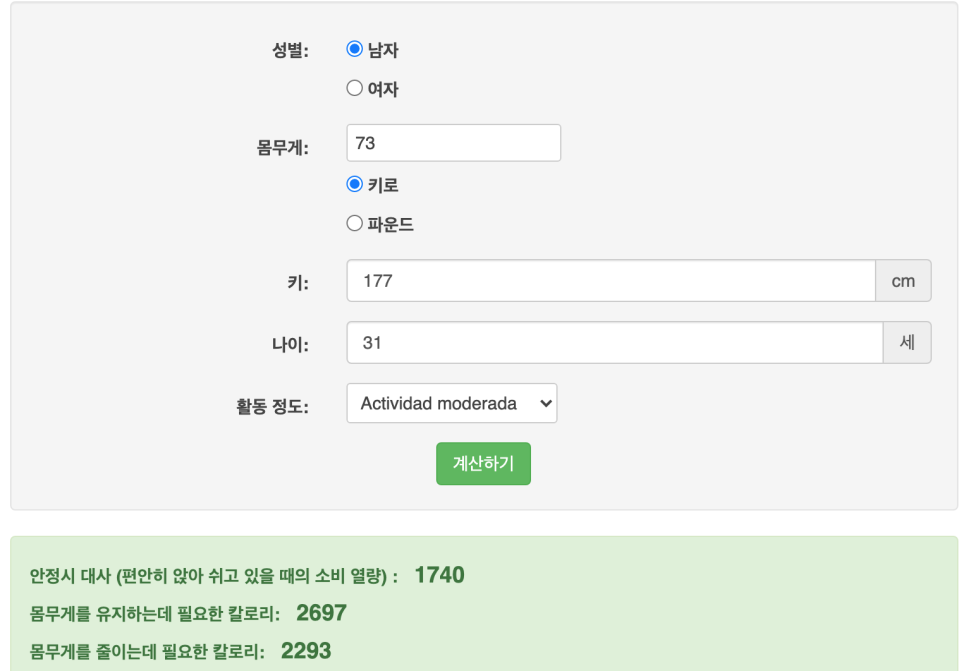 위 사이트로 들어가신 후에 아래 사진처럼 성별, 몸무게, 키, 나이순으로 입력합니다!